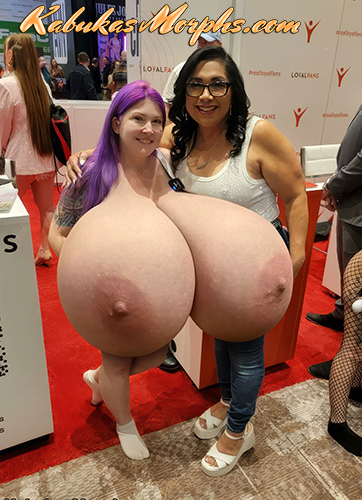 Demora Avarice exposing her huge tits in a convention, and 9 breast expansion morphs.
